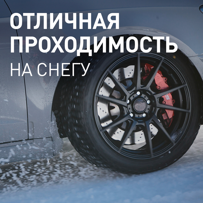Благодаря особенному V-образному рисунку протектора с высокой плотностью и оптимальным углом расположения центральных кромок увеличивается проходимость в глубоком снегу.